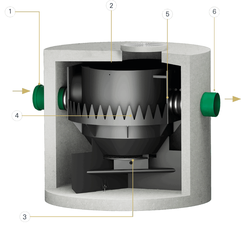 Zunächst wird das Wasser in der Mitte des Systems tangential in die Sedimentationsanlage eingeleitet. Die Sedimentation von Feststoffen findet nun durch den sogenannten Teetasseneffekt statt. Die Feststoffe sinken in den unten liegenden Schlammfang, der durch ein Gitterrost und Strömungsbrecher hydraulisch vom Behandlungsraum getrennt ist, so dass es bei Starkregen zu keiner Remobilisierung der abgesetzten Partikel kommt.